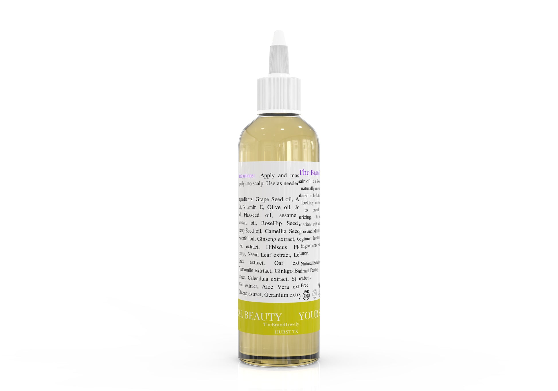 Ingredients: Grape Seed oil, Argan Oil, Vitamin E, Olive oil, Jojoba oil, Flaxseed oil, Sesame oil, RoseHip Seed oil, Camellia Seed oil, Olive Leaf extract, Hibiscus Flower extract, Neem Leaf extract, Lemon Grass extract, Oat extract, Chamomile extract, Calendula extract, Aloe Vera extract, Ginseng extract, Geranium extract, and 6 other natural carrier oils included.